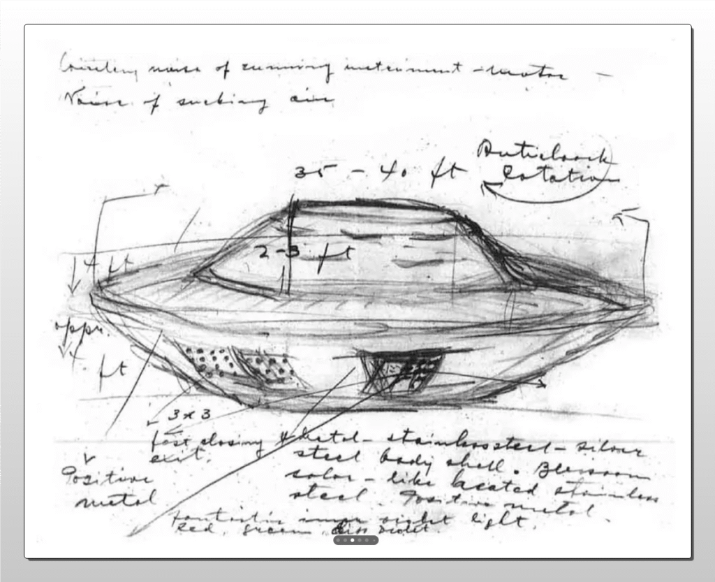 L’un des objets se posa à une cinquantaine de mètres de lui, dégagement une odeur de soufre et un léger sifflement. Rapidement, une trappe s’ouvrit, laissant échapper une lumière intense et des sons évoquant des voix inintelligibles. Dans un souci professionnel, Michalak tenta d’établir le contact, multipliant les langues étrangères et questionnant l’origine militaire ou expérimentale du vaisseau. N’obtenant aucune réponse et constatant l’absence de marquage visible, il s’approcha prudemment de l’appareil, sa visière rabattue pour se protéger des rayons luminescents.