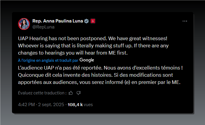 « L’audition sur les PAN n’a pas été reportée. On a des témoins de ouf ! Ceux qui disent ça, ils inventent des trucs. – S’il y a des changements concernant les auditions, vous l’entendrez de MOI en premier. » – La Rep. Anna Luna à propos des allégations selon lesquelles l’audition sur les OVNI est annulée, d’abord diffusées par Eric Davis.
